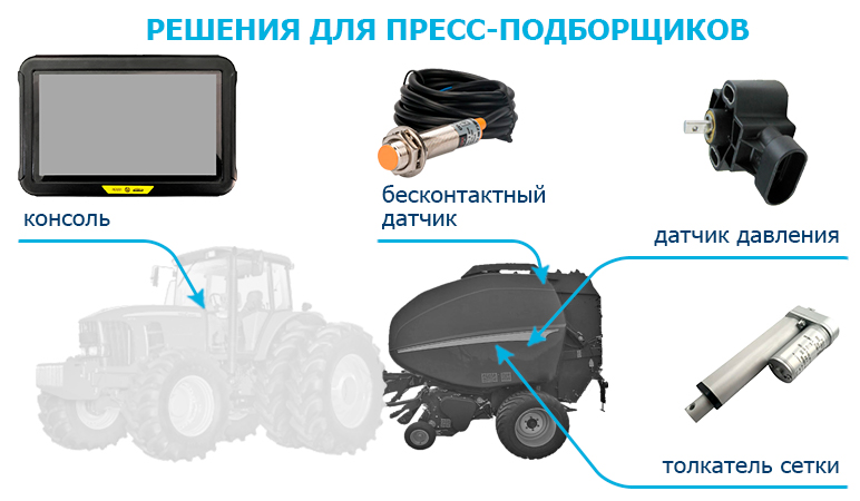 Разработка решений под конкретные условия использования: управление сеялкой точного высева, разбрасывателем удобрений, пресс-подборщиком, дооборудование комбайна, установка гидравлического управления рулем на тракторы.